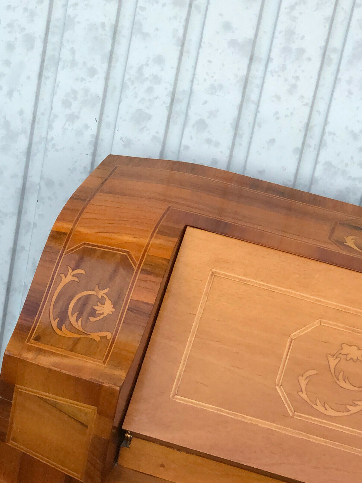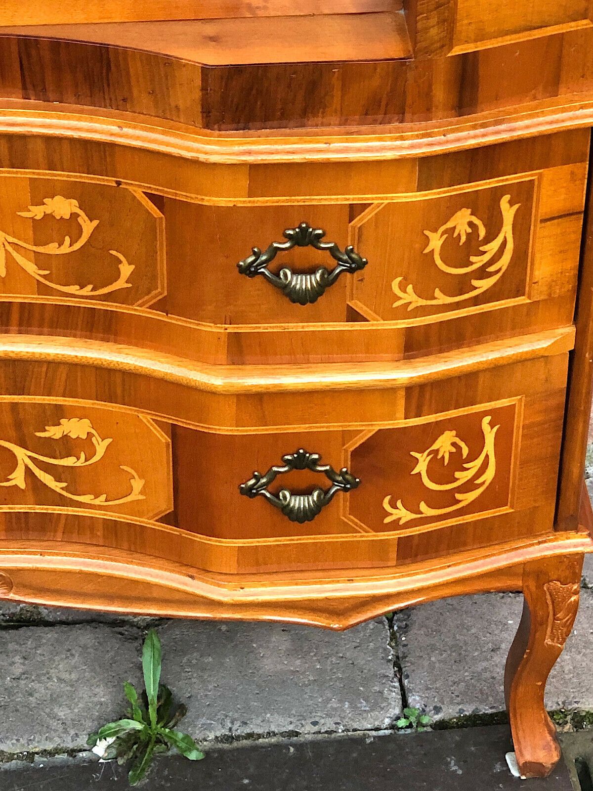 Die Antik Kirschbaum Kommode Sekretär ist ein wahrer Hingucker! Mit 2 Schubladen und kunstvollen Intarsien ist sie nicht nur funktional, sondern auch ein extravagantes Möbelstück mit opulenten Stil.