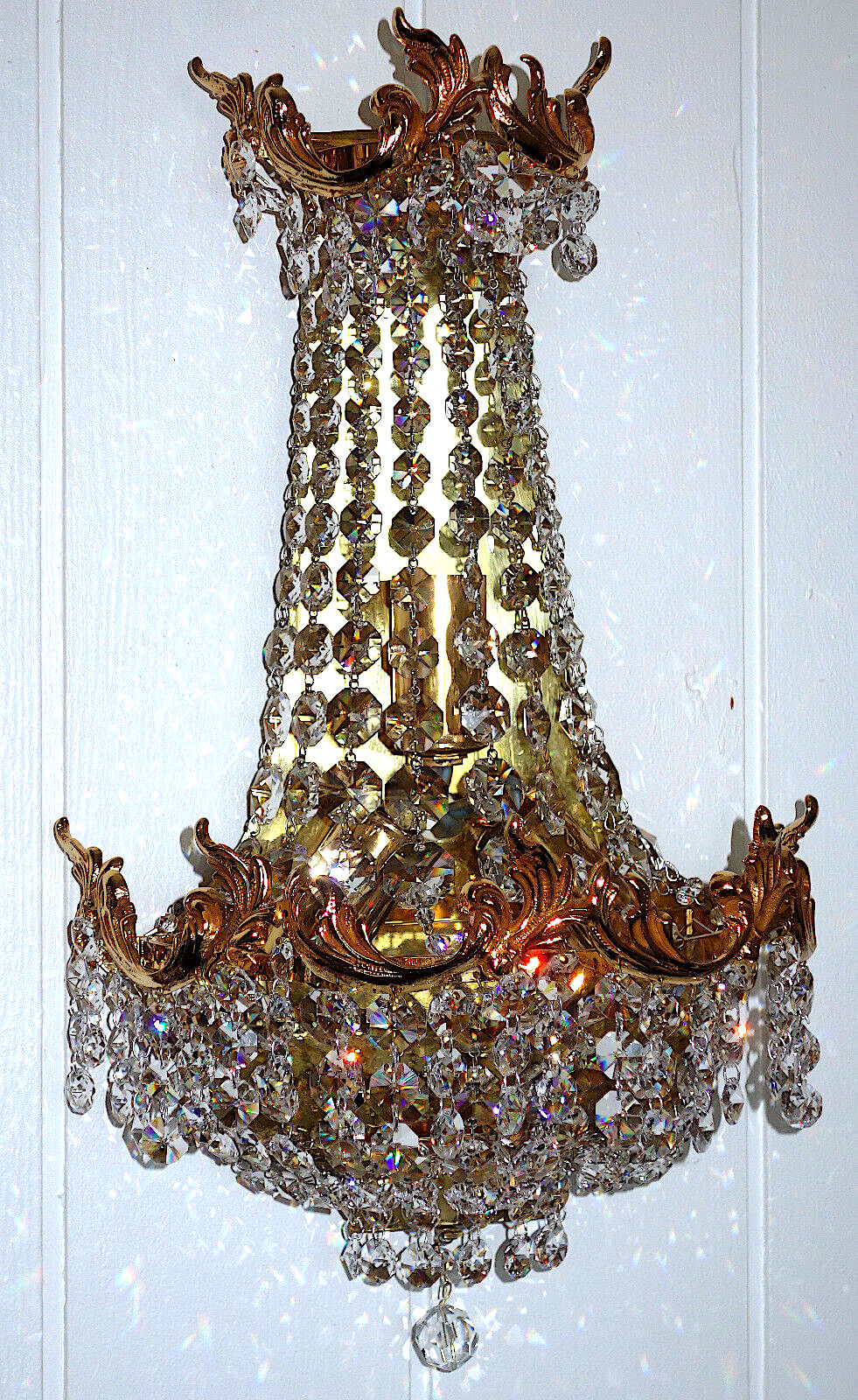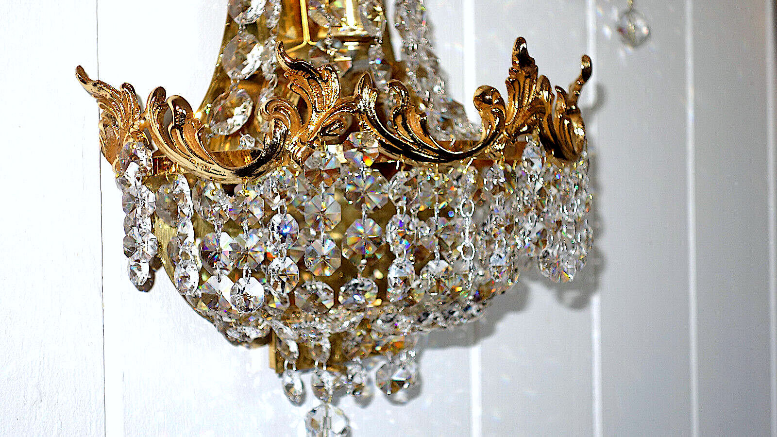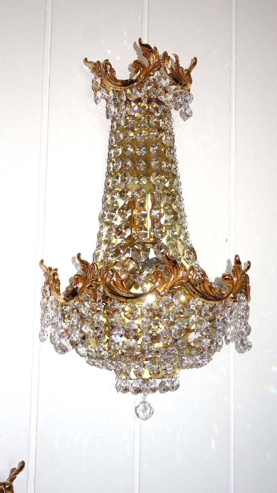 Ein paar wunderschöne hochwertige seltene Messing Bleikristall Wandlampen von PALWA