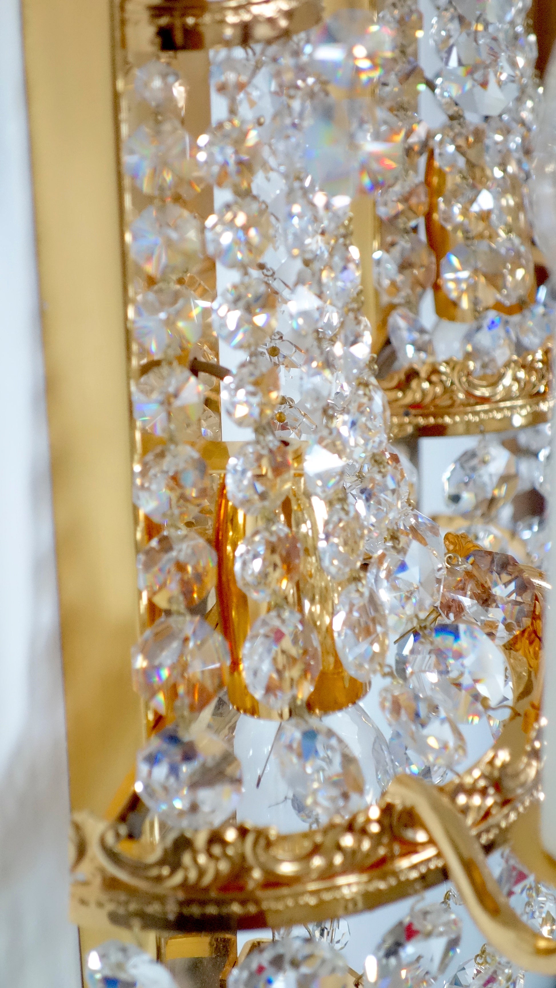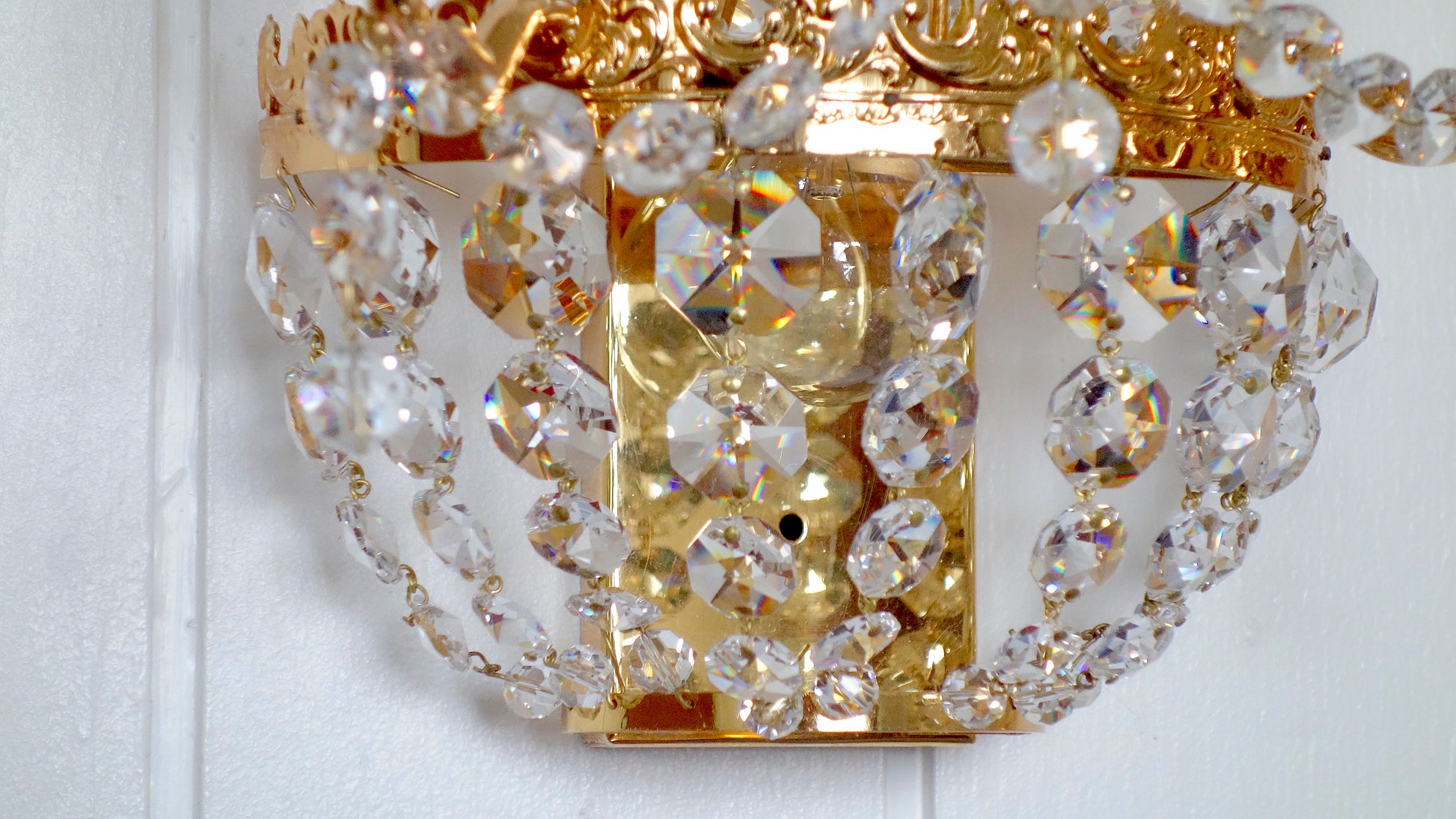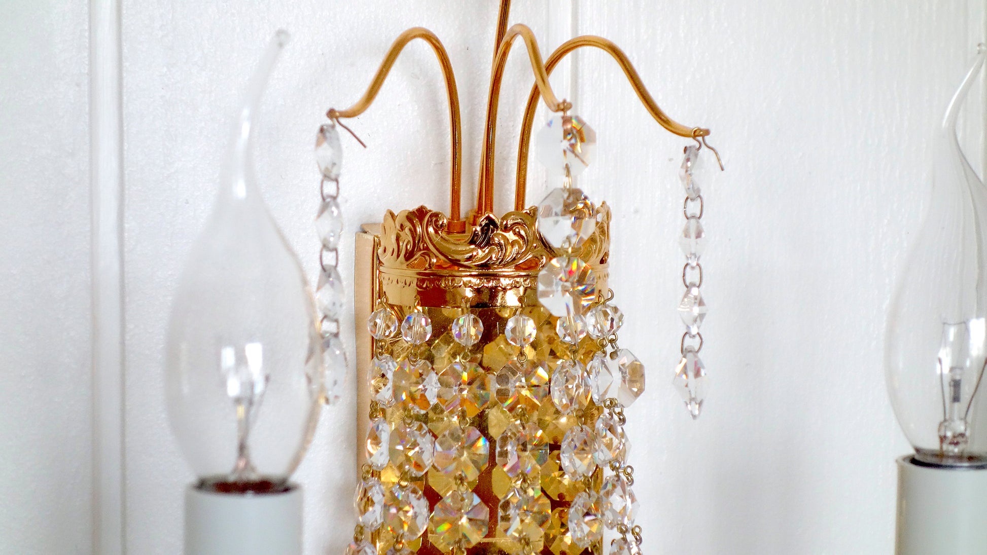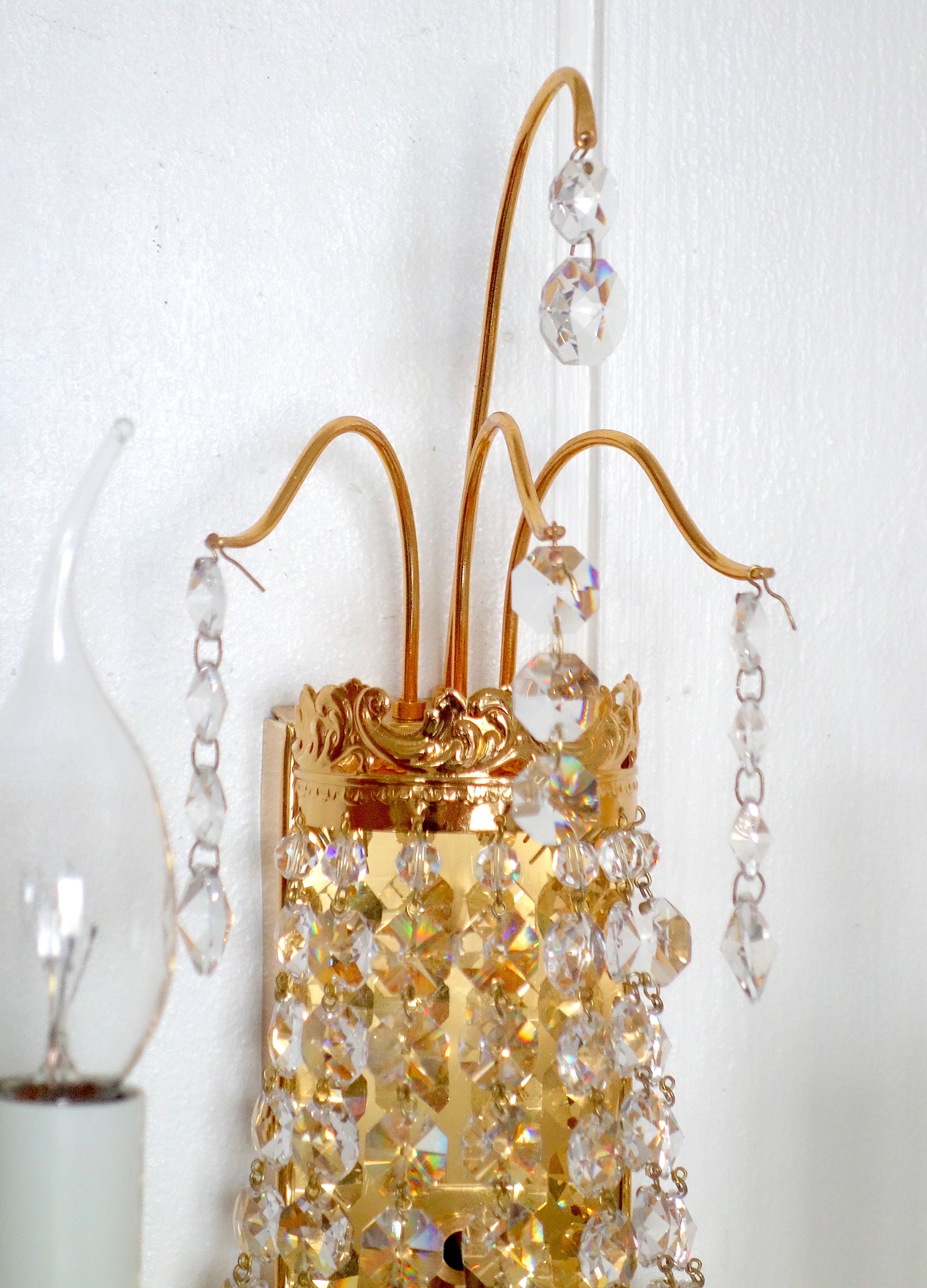 Die Wandlampen von Palwa aus Bleikristall Prismen und Perlen und Messing sind Vintage-Highlights aus den 1970er.