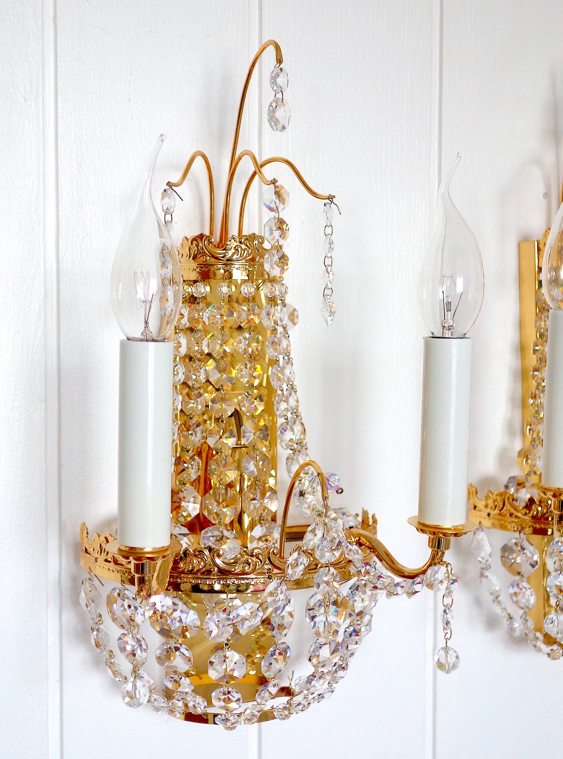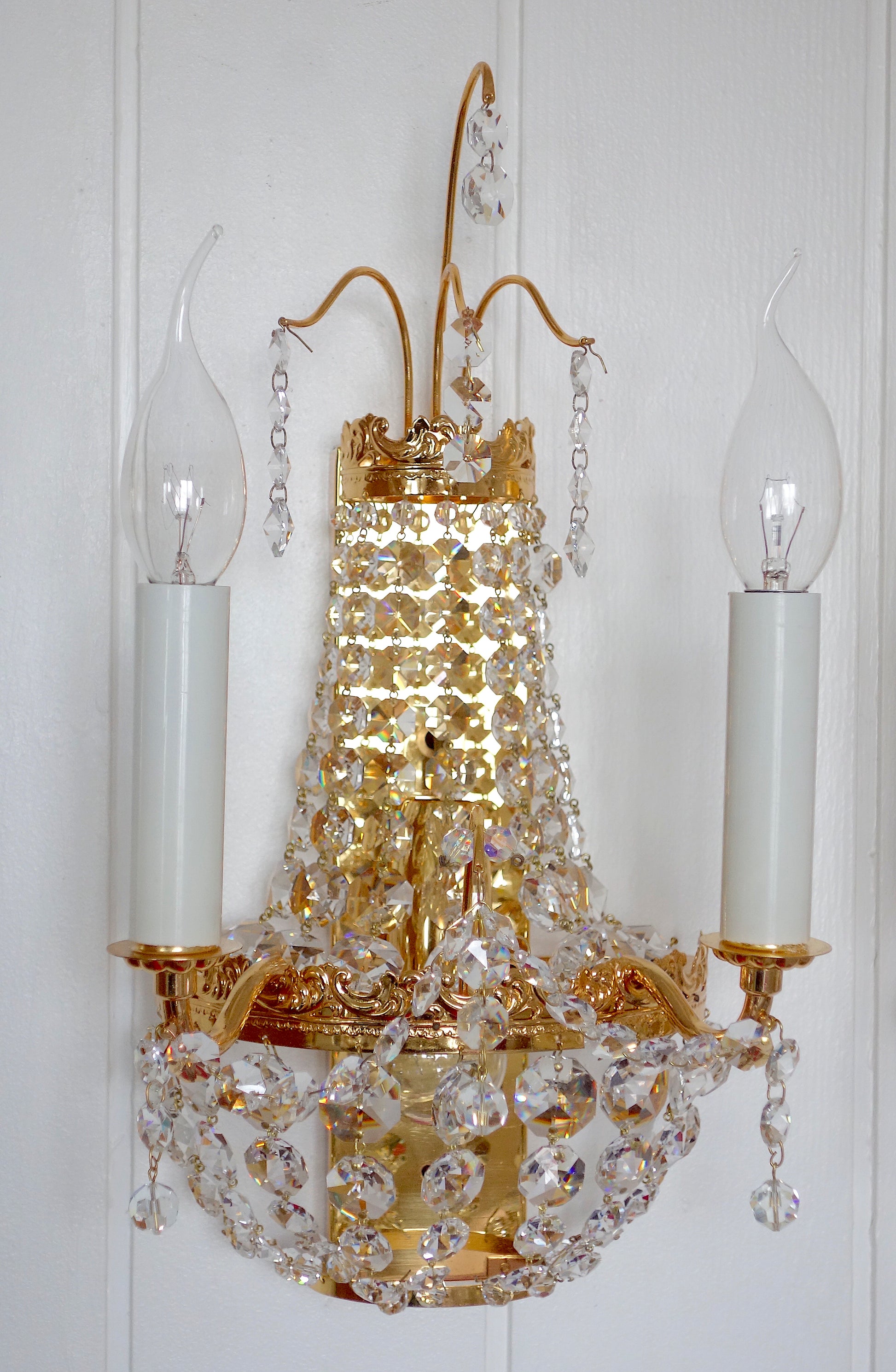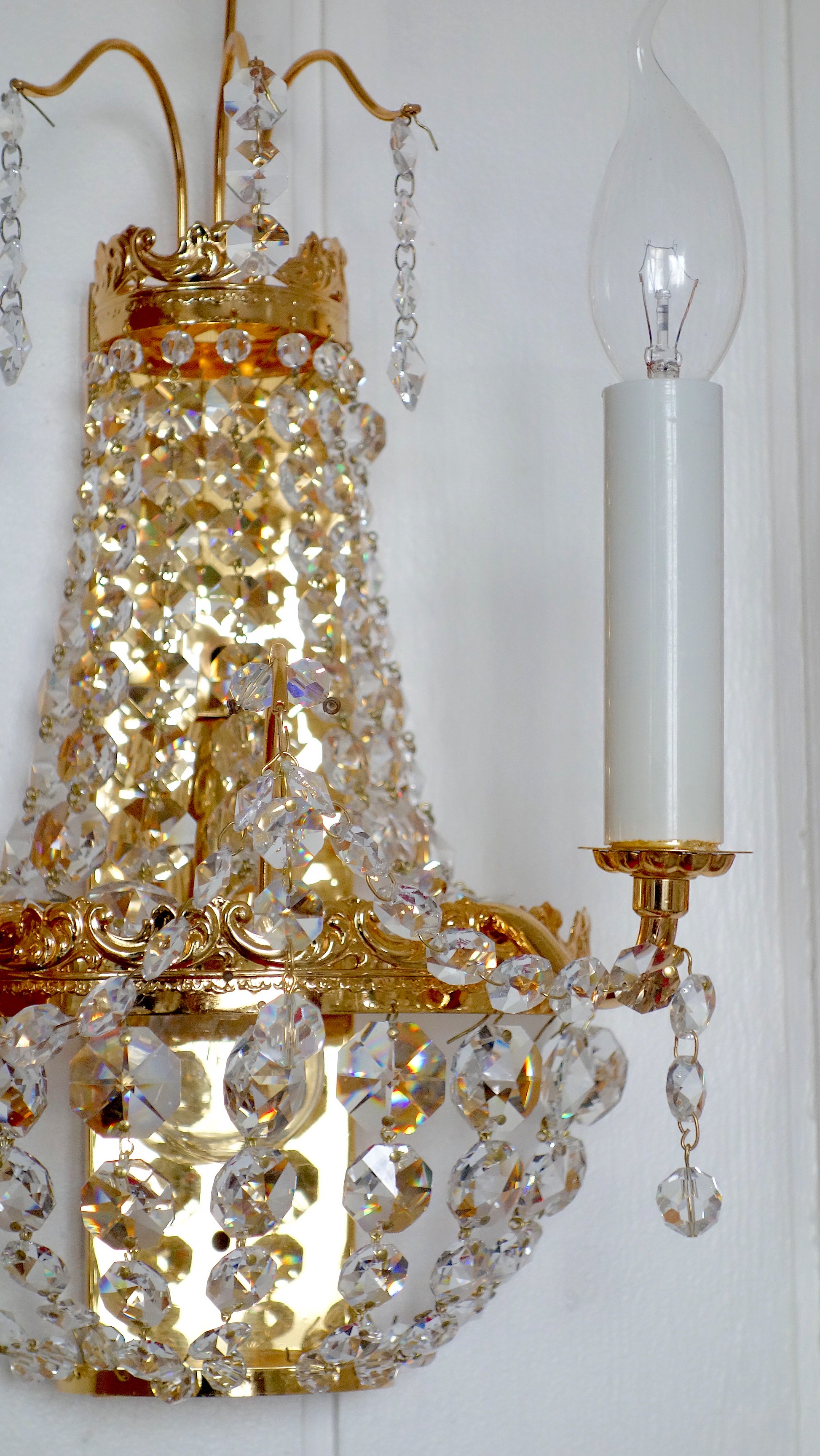 Die Wandlampen von Palwa aus Bleikristall Prismen und Perlen und Messing sind Vintage-Highlights aus den 1970er.