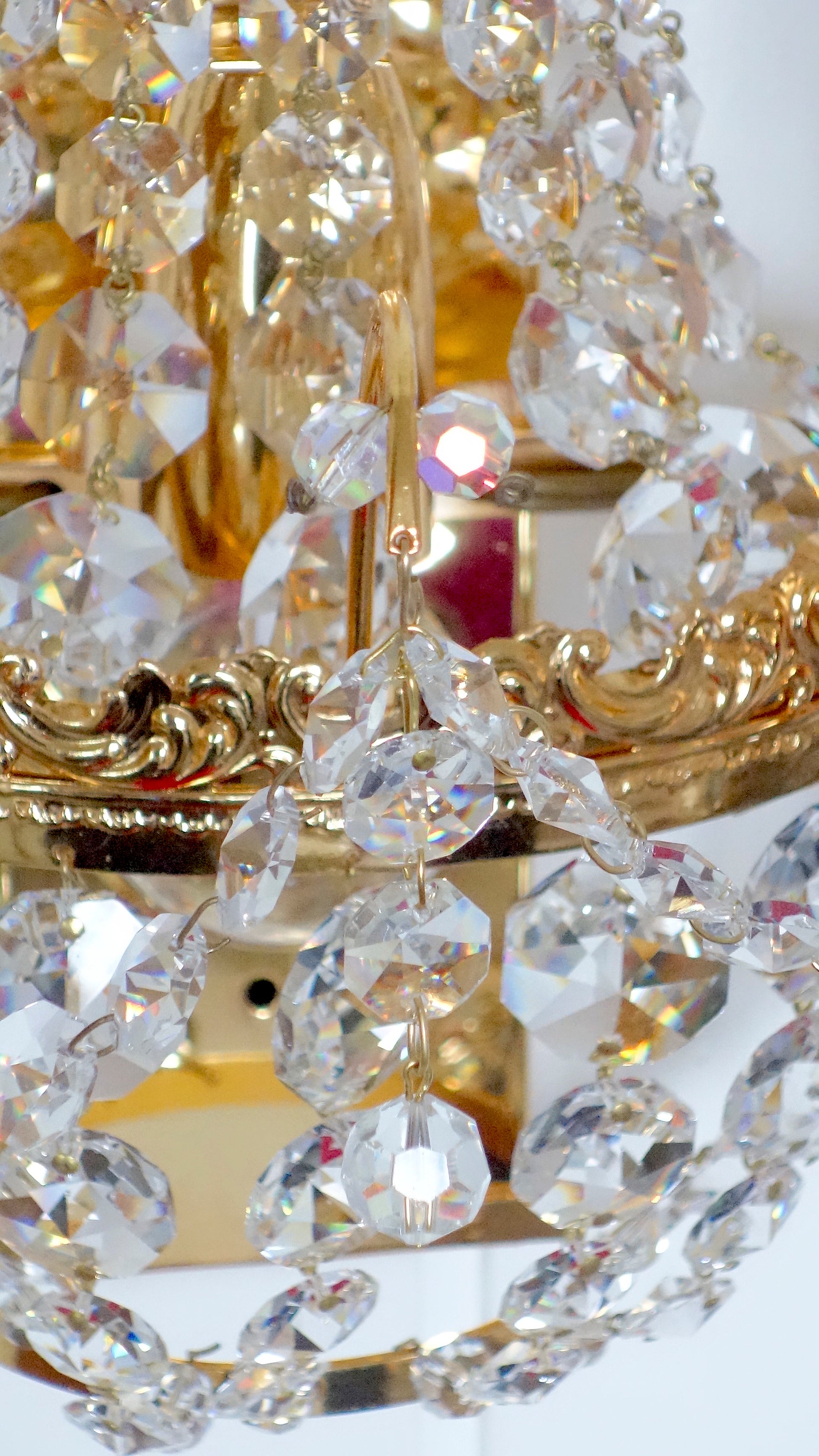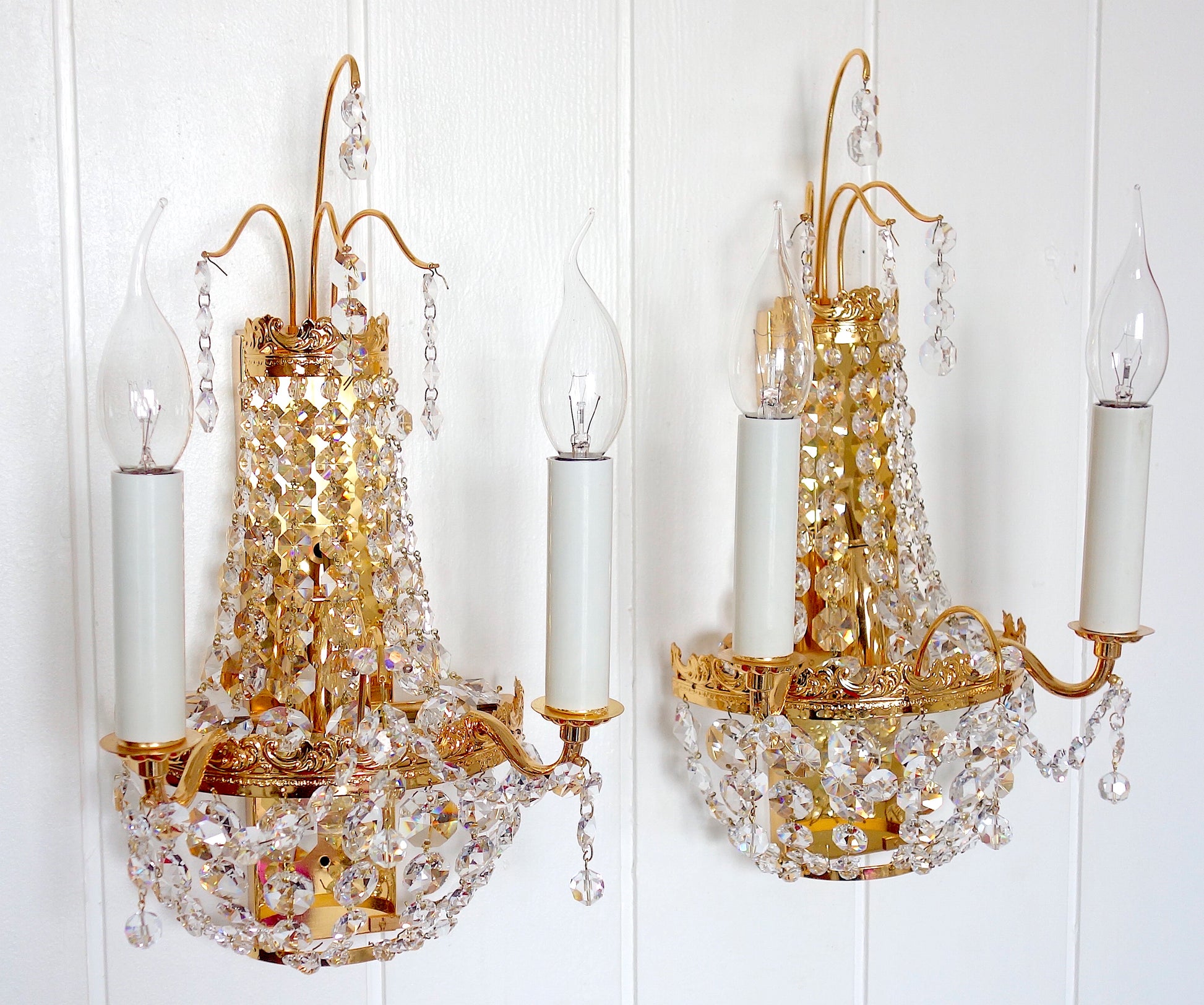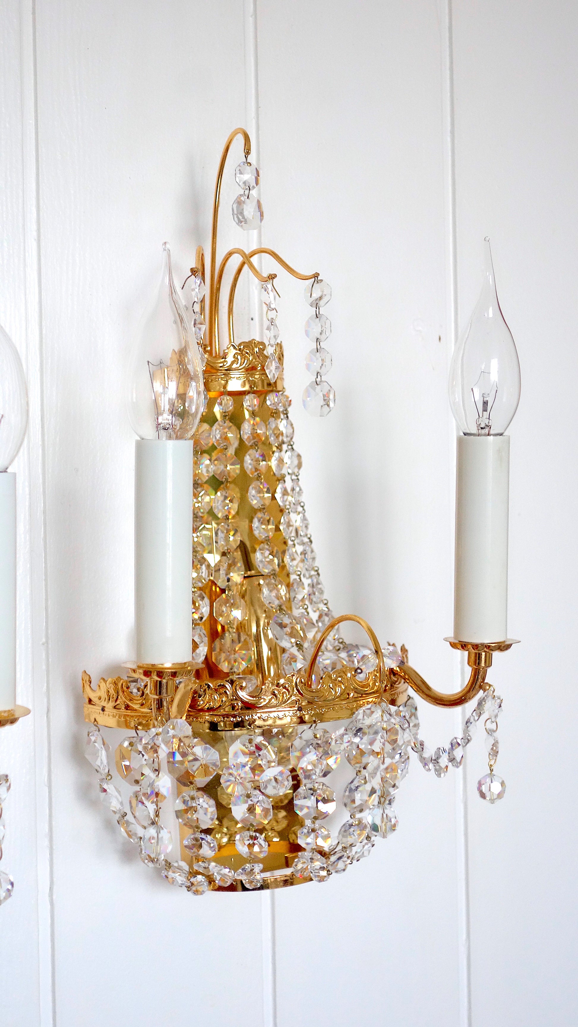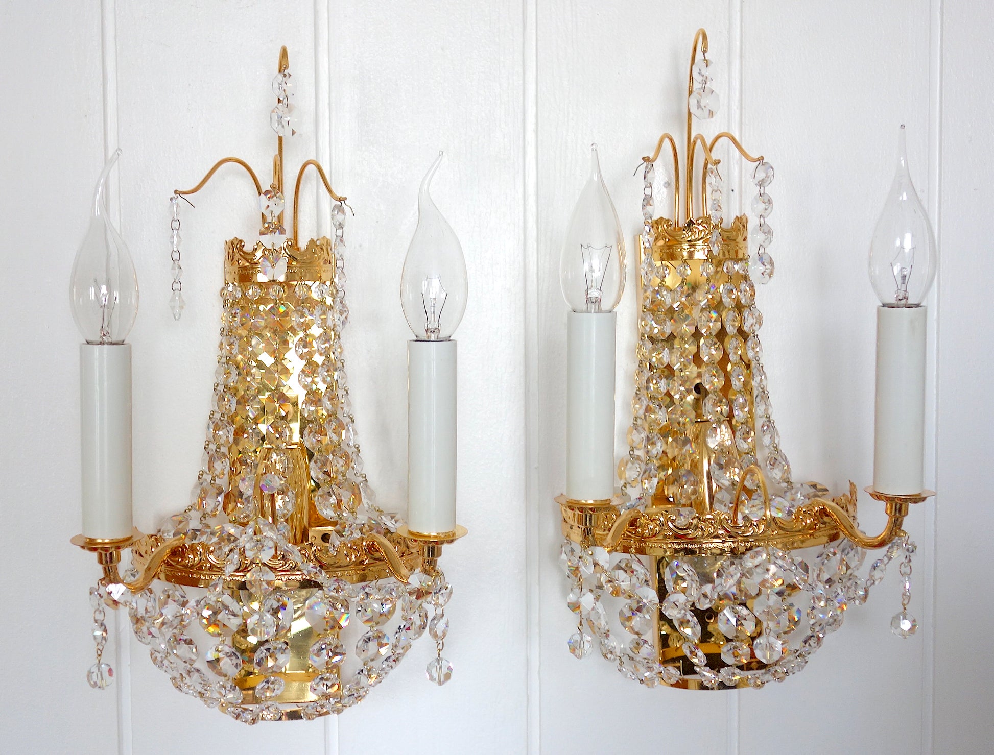 Die Wandlampen von Palwa aus Bleikristall Prismen und Perlen und Messing sind Vintage-Highlights aus den 1970er.