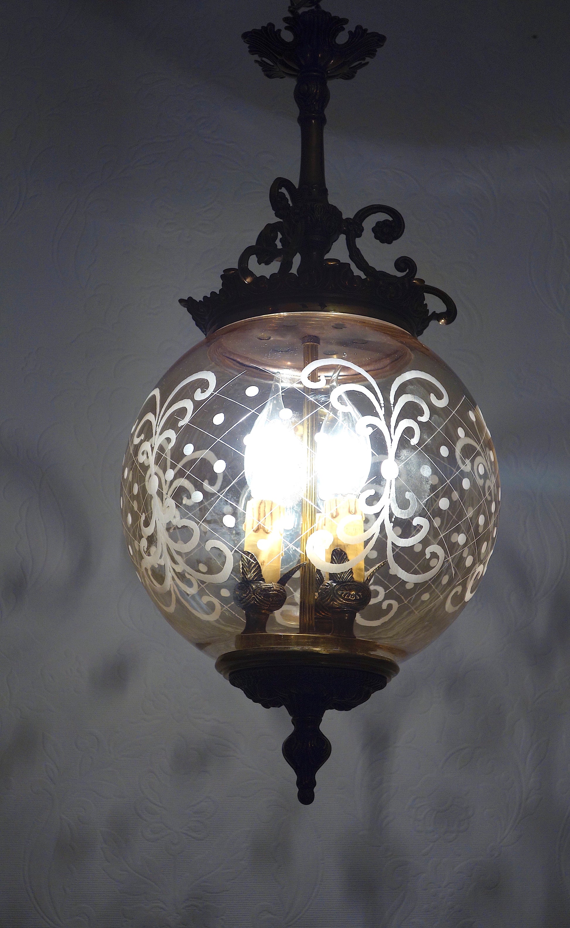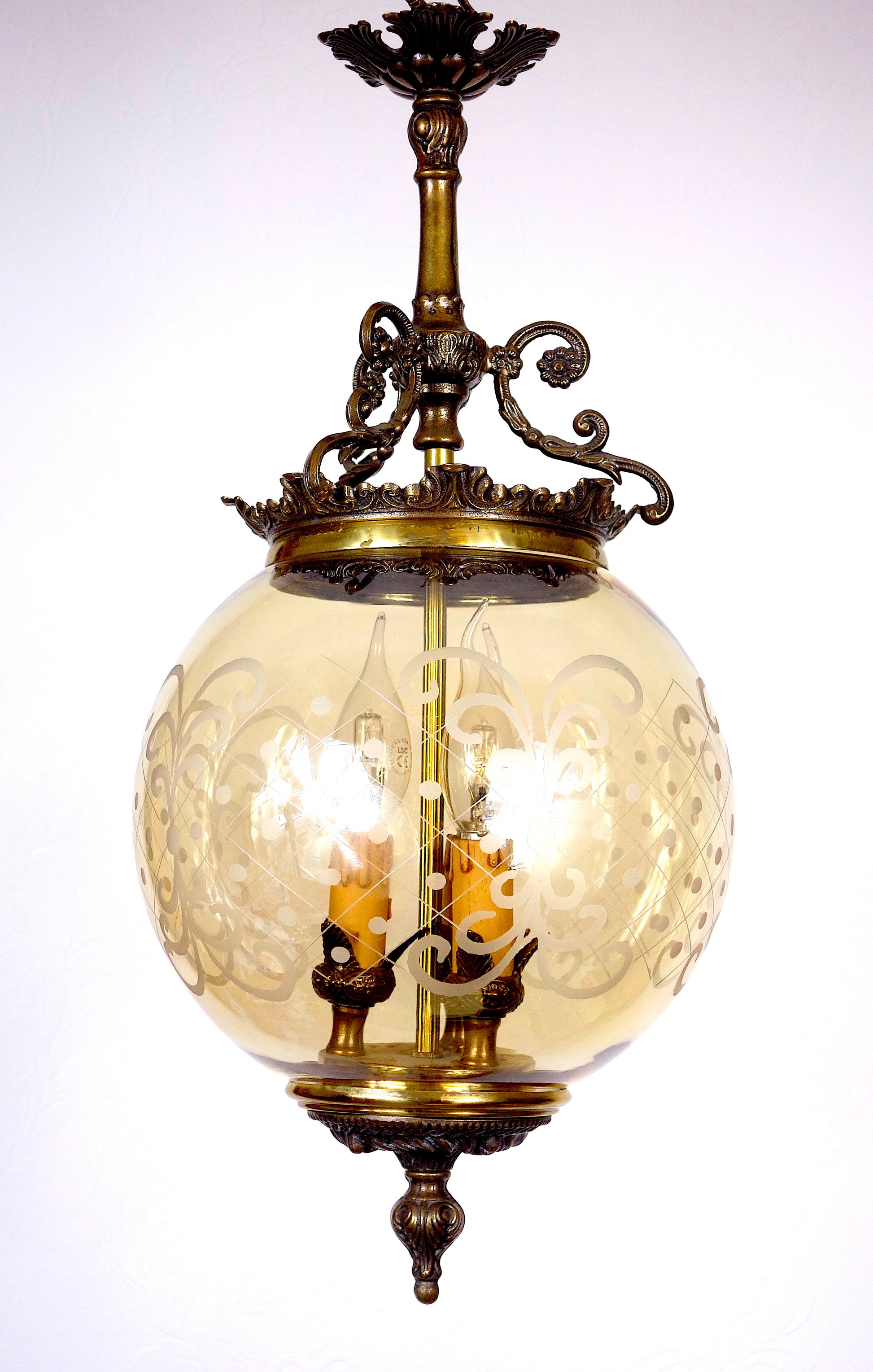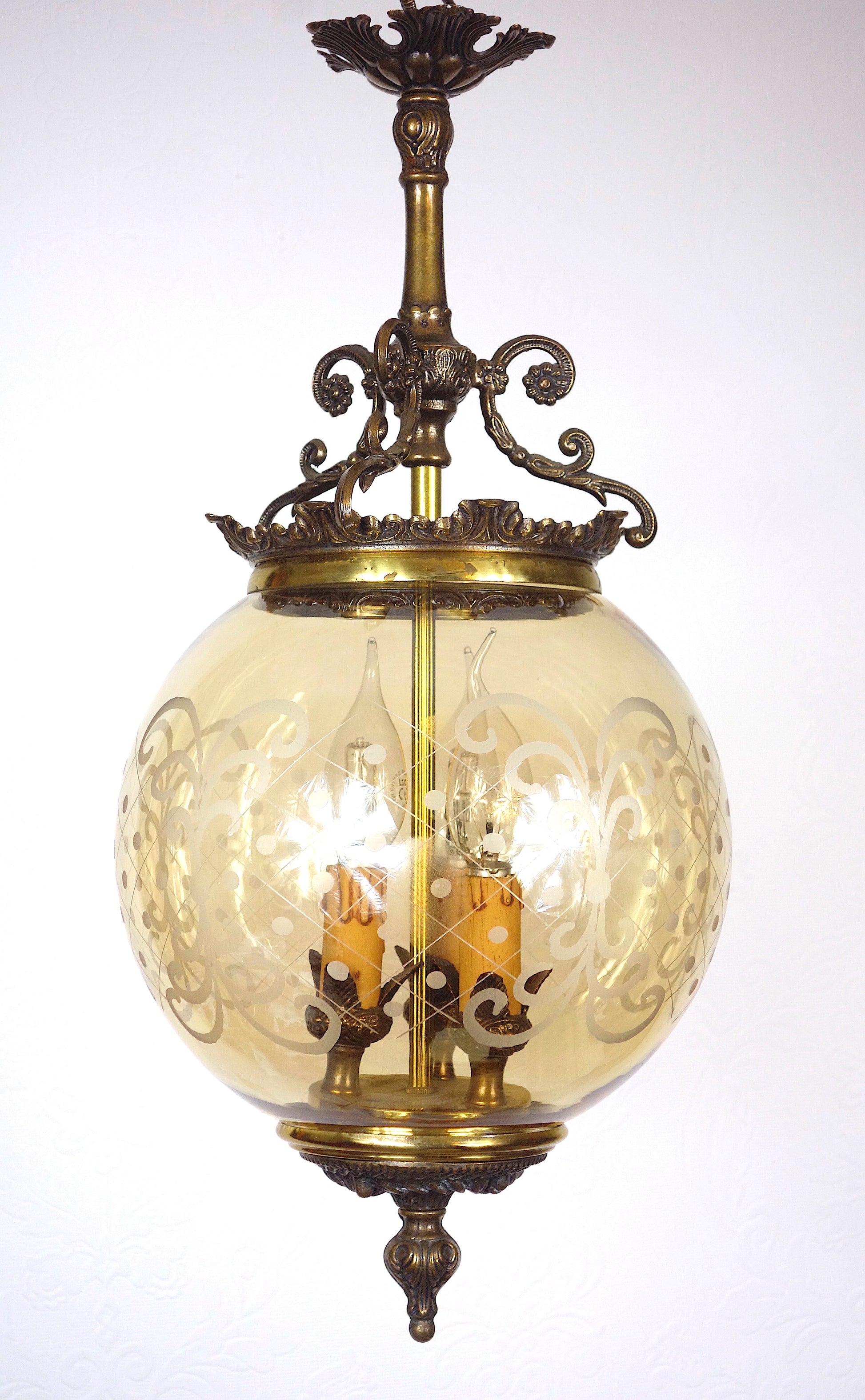 Wunderschöne Antik Messing Glas Hollampe, Kronleuchter, Lüster, 1940er